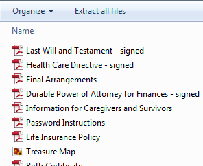 IMPORTANT LEGAL NOTE: It’s tempting to keep everything, including the important directives and your will in only electronic form (even when they’re signed). Unfortunately, most states require the original signed documents to be considered legal and most courts will not accept a copy. For this reason, you should still have the paper originals somewhere such as a fireproof safe. However, be careful where you put the originals: although it might sound convenient to put them in a bank safety deposit box, there’s usually a rather long waiting period before a before a bank can legally provide access to your box to a survivor, so don’t put any time sensitive items there. My recommendation at the current time would be to include copies of the signed originals in your encrypted file and also include detailed instructions on where the originals are located and how to access them.